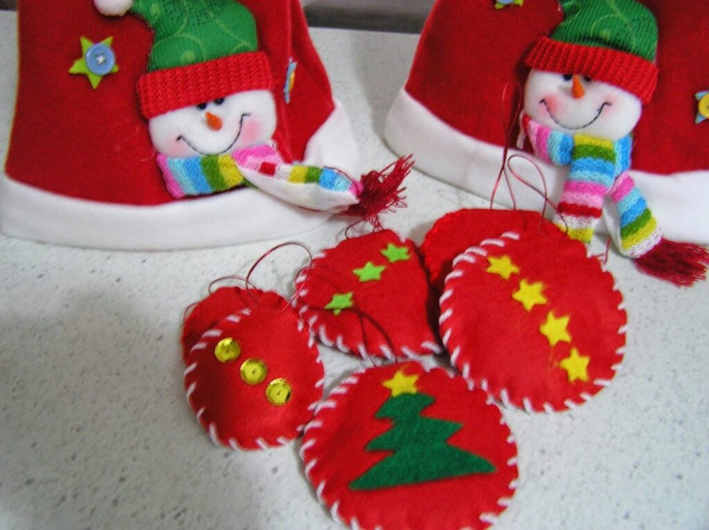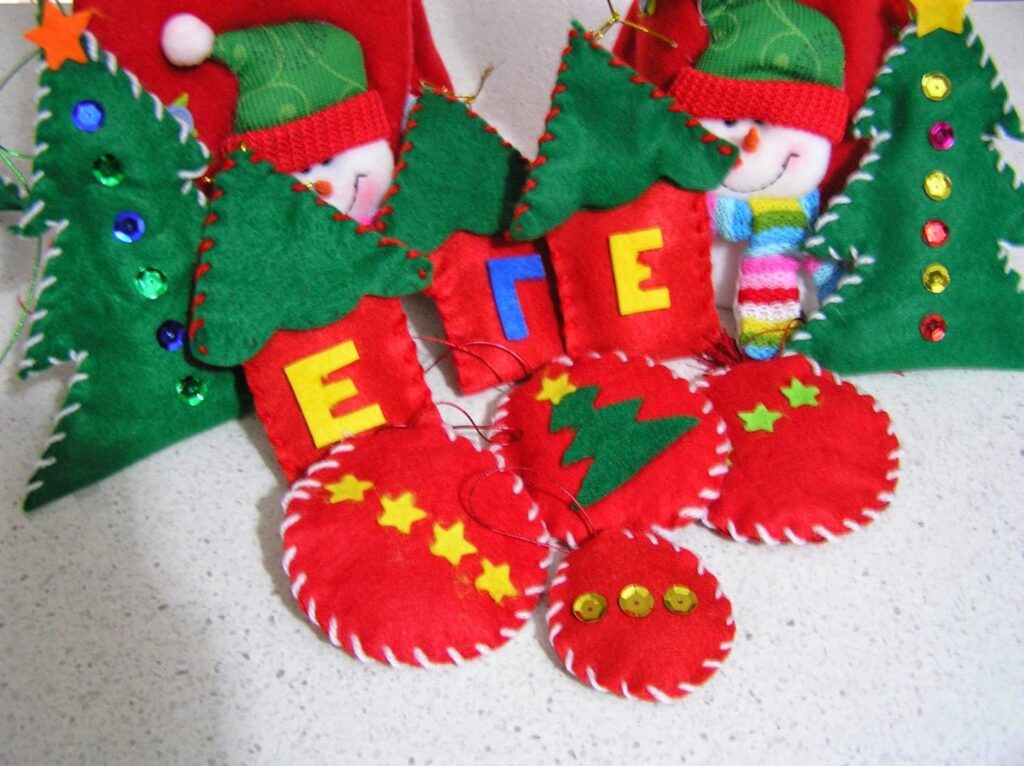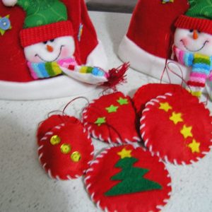 Σειρά είχαν οι τσόχινες μπάλες σε δύο μεγέθη και τα τσόχινα αστεράκια. Τα έραψα στο χέρι με λευκή ή κόκκινη κλωστή. Τα στόλισα με χάντρες, χρυσόσκονη, κορδέλα, κουμπιά ή μικρά τσόχινα σχέδια πχ. δεντράκι, αστεράκια, γιρλάντες.