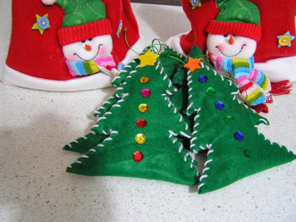 Πρώτα έφτιαξα δεντράκια με πράσινη τσόχα. Τα πρώτα τα γάζωσα στη ραπτομηχανή. Μετά κάποια τα έραψα στο χέρι με χοντρή κλωστή, άλλα με πράσινη, άλλα με άσπρη και άλλα με κόκκινη. Προσωπικά, μου αρέσουν περισσότερο αυτά που είναι ραμμένα στο χέρι. Μετά με κόλλα υφάσματος ή με σιλικόνη κόλλησα πάνω στα δεντράκια μου χάντρες ή τσόχινα στολίδια.