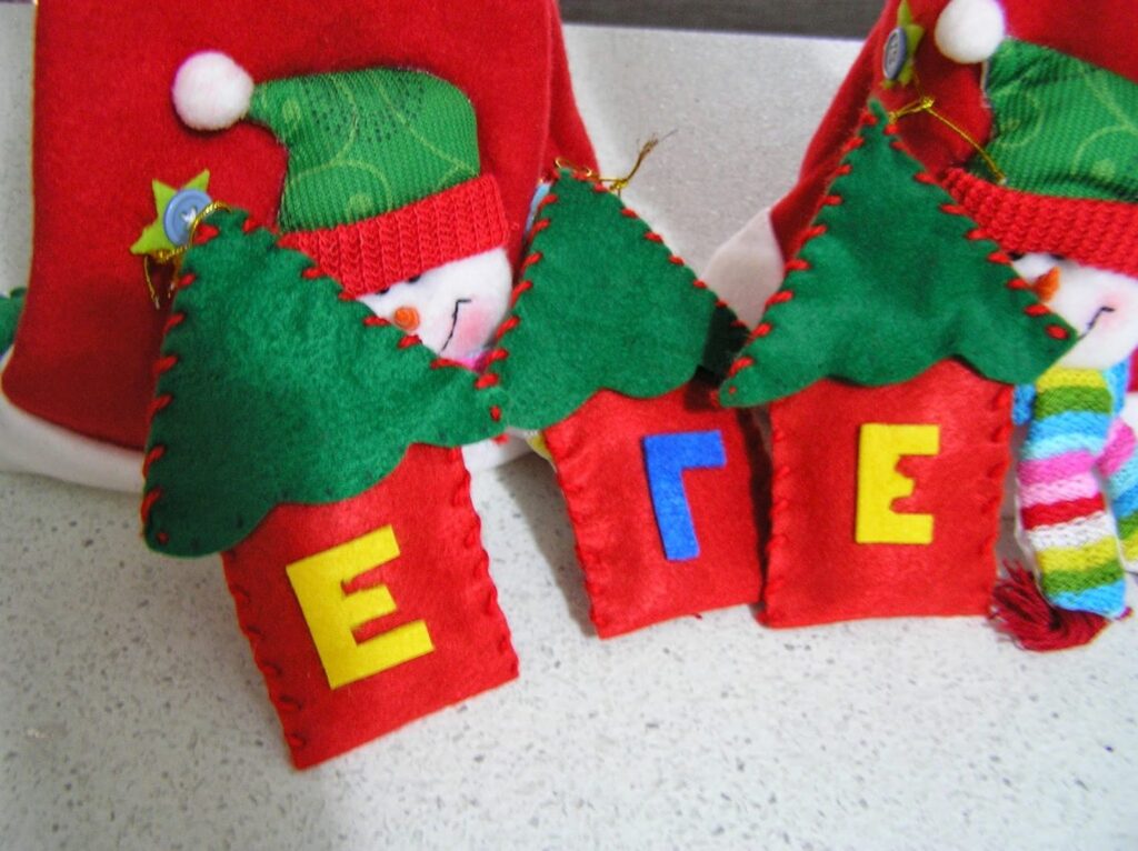 Τελευταία έφτιαξα τα μικρά σπιτάκια ξωτικών. Με μικρά κομμάτια τσόχα έφτιαξα και κόλλησα πάνω στα σπιτάκια τα αρχικά γράμματα των «παραμυθένιων» μου και των φίλων μας που θα τα χαρίσουμε.