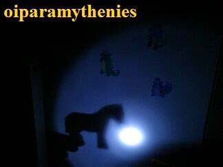 - Θέατρο σκιών. Κάτι που αρέσει και στις μικρές μου. Σβήνουμε τα φώτα, παίρνουμε ένα φακό και με μικρές κούκλες ή ζωάκια κάνουμε σκιές πάνω στο τοίχο, δημιουργώντας μια ιστορία.