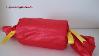 Έφτιαξα και μια καραμέλα για τις στέκες από τις παραστάσεις, στολές, παιχνίδι. Σε αυτήν την καραμέλα χρησιμοποίησα τα κυκλικά χαρτόνια από 3 τελειωμένα ρολά χαρτιών κουζίνας. Τα έστησα σε πυραμίδα. Τα κόλλησα μεταξύ τους και τα έντυσα με ίδιο τρόπο.