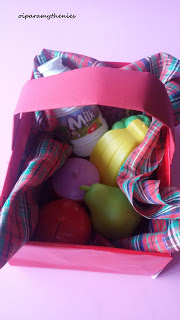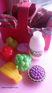 - Γεμίζετε το καλαθάκι με ψεύτικα φρούτα, λαχανικά κ.α.