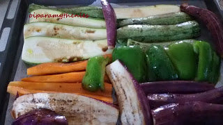 Απλώστε μια λαδόκολλα σε ταψί ρηχό. Τοποθετείστε τα κομμένα και μαριναρισμένα λαχανικά.