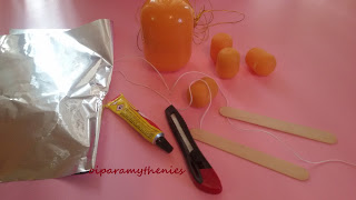 Το πάνω μέρος του σπάγκου το δένετε με γλωσσοπίεστρα. Στα γλωσσοπίεστρα πρώτα έχετε κάνει μια τρύπα για να δέσετε σπάγκο και τα έχετε κολλήσει δημιουργώντας σχήμα σταυρού για να μπορούν να κρατούν με τα χεράκια τους τα παιδιά και να παίζουν.