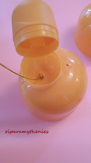 Στη τρύπα που είναι στο πάνω μέρος της μεγάλης συσκευασίας θα περάσετε σπάγκο. Εννοείται οτι εσωτερικά κάνετε κόμπο για να μην βγαίνει ο σπάγκος.