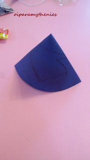 Φτιάξετε με ένα μικρό κομμάτι χαρτόνι ένα τριγωνικό καπέλο με τρύπα για να περάσει ο σπάγκος.