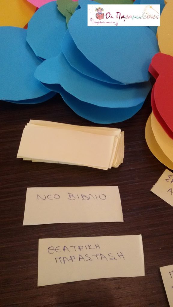Σε μικρά χαρτάκια έγραψα τη δραστηριότητα της ημέρας ή γρίφο για να βρούν το κρυμμένο δωράκι!! Το δίπλωσα ώστε να χωράει μέσα στη χαρτονένια μπάλα.