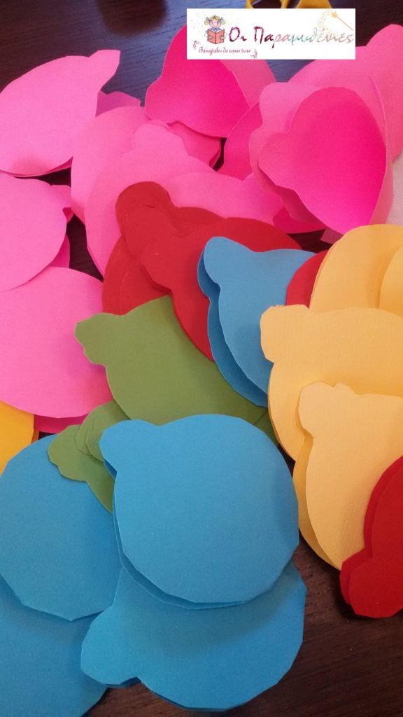 Μετά έκοψα σε σχήμα μπάλας και σε διάφορα χρώματα χαρτόνια που είχα διπλώσει στα δύο, ώστε μέσα να κρυφτεί ένα χαρτάκι με την δραστηριότητα ή δώρο της ημέρας.