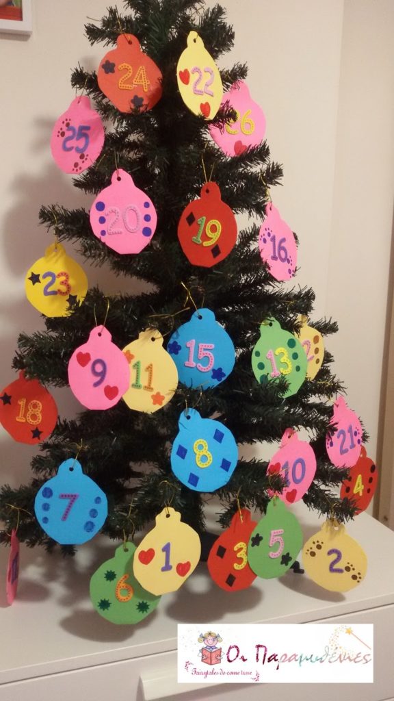 Έτσι, το φετινό ημερολόγιο μας είναι ένα δέντρο στολισμένο με μπάλες φτιαγμένες απο χαρτόνι που κρύβουν εκπλήξεις.