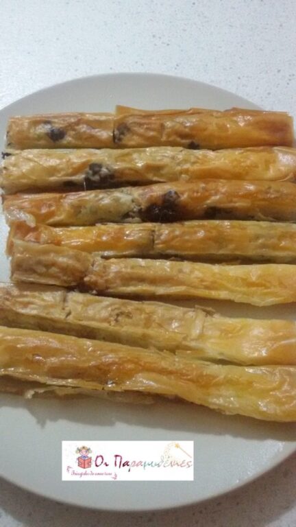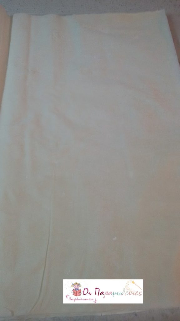 Ανοίγουμε τα φύλλα κρούστας και τα κόβουμε στη μέση.