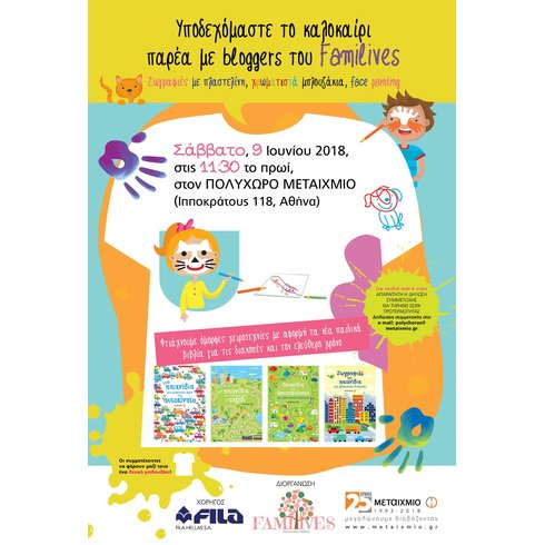 Και σας έχω και μια εκδήλωση που δεν πρέπει να χάσετε. Θα έχουν την ευκαιρία οι μικροί μας φίλοι να μάθουν για αυτά τα βιβλία στο Πολυχώρο Μεταίχμιο, να απασχοληθούν δημιουργικά απο bloggers του Familives (με όμορφες κατασκευές και face painting) και να αποκτήσουν και ένα δωράκι απο την εταιρεία Fila Hellas που θα είναι χορηγός της εκδήλωσης