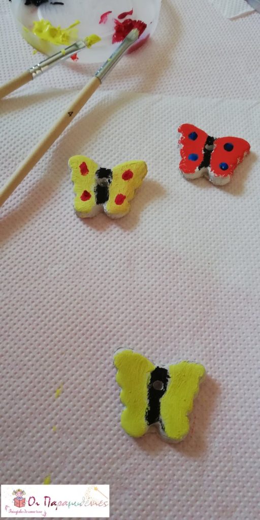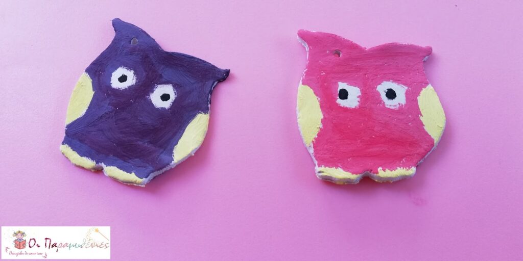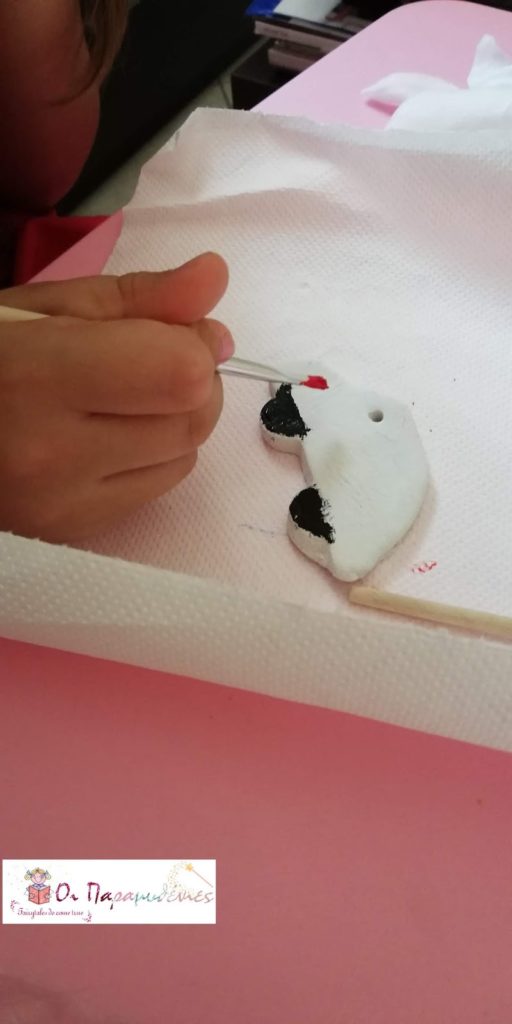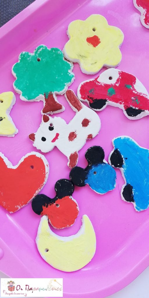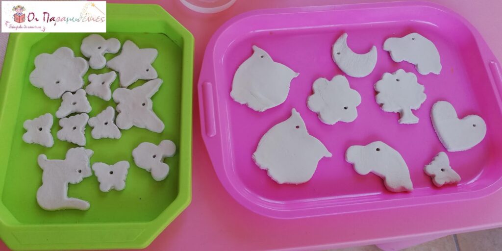 Έπλασαν πηλό και με κουπ ατ τον έκοψαν σε διάφορα σχέδια. Στο πάνω μέρος με τη βοήθεια ενός καλαμακιου έκαναν μια μικρή τρύπα. Τα άφησαν να στεγνώσουν μια ημέρα.