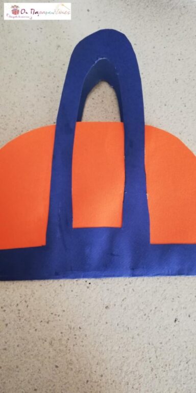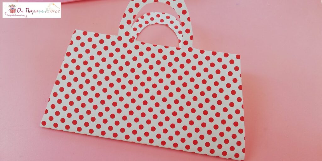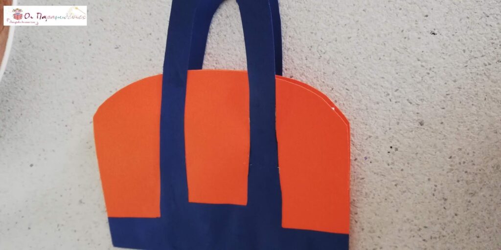 Διπλώσαμε στη μέση το χαρτόνι. Κόψαμε σε περίγραμμα να μοιάζει με τσαντάκι και κόψαμε να σχηματιστεί το χερούλι. Εσωτερικά κολλήσαμε χαρτί σε απαλό χρώμα για να γράψουν τις ευχές τους.