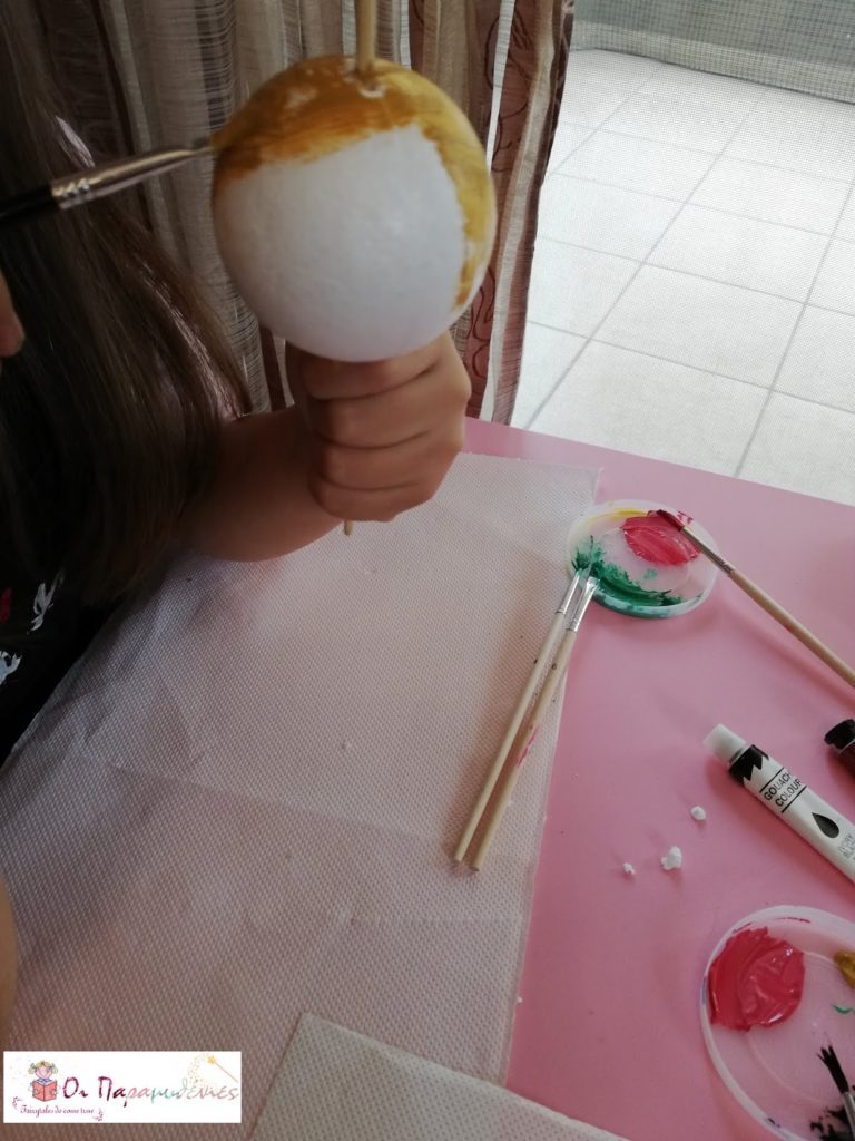 Περάστε στις μπάλες φελιζόλ το ξυλάκι. Πρώτον, για να μπορείτε να τις ζωγραφίσετε και δεύτερον για να μπορείτε να περάσετε μετά το κορδόνι και να τις κρεμάσετε.