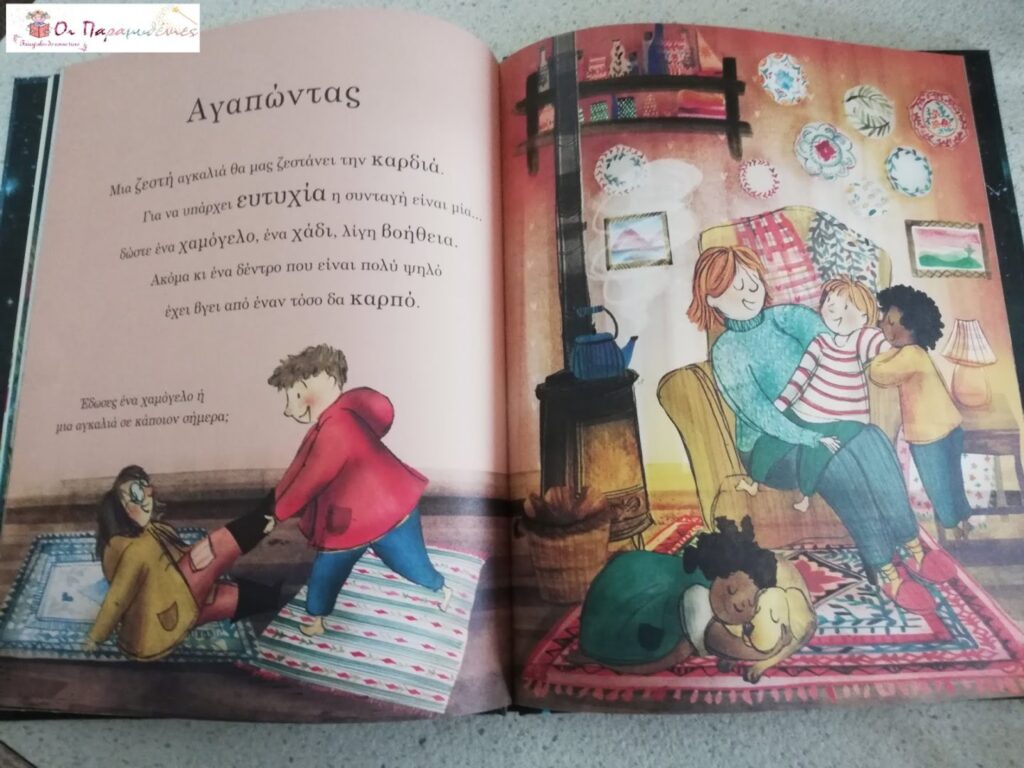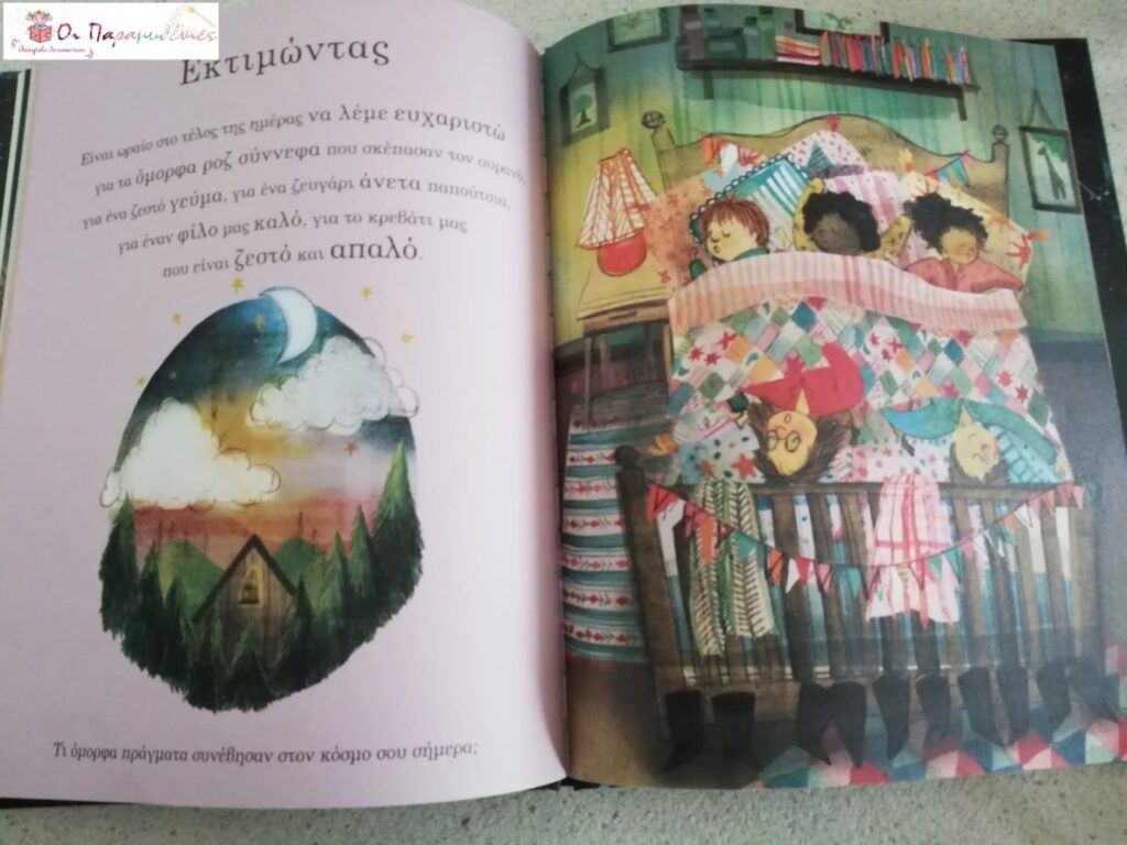 Διαβάζοντας το με τις μικρές μου συζητούσαμε με αφορμή τις ερωτήσεις που έχει στο τέλος κάθε σελίδας. Π.χ. Νιώθωντας……. Ποιά πράγματα σε κάνουν να νιώθεις όμορφα; ή Εκτιμώντας…….Τι όμορφα πράγματα συνέβησαν στον κόσμο σου σήμερα;