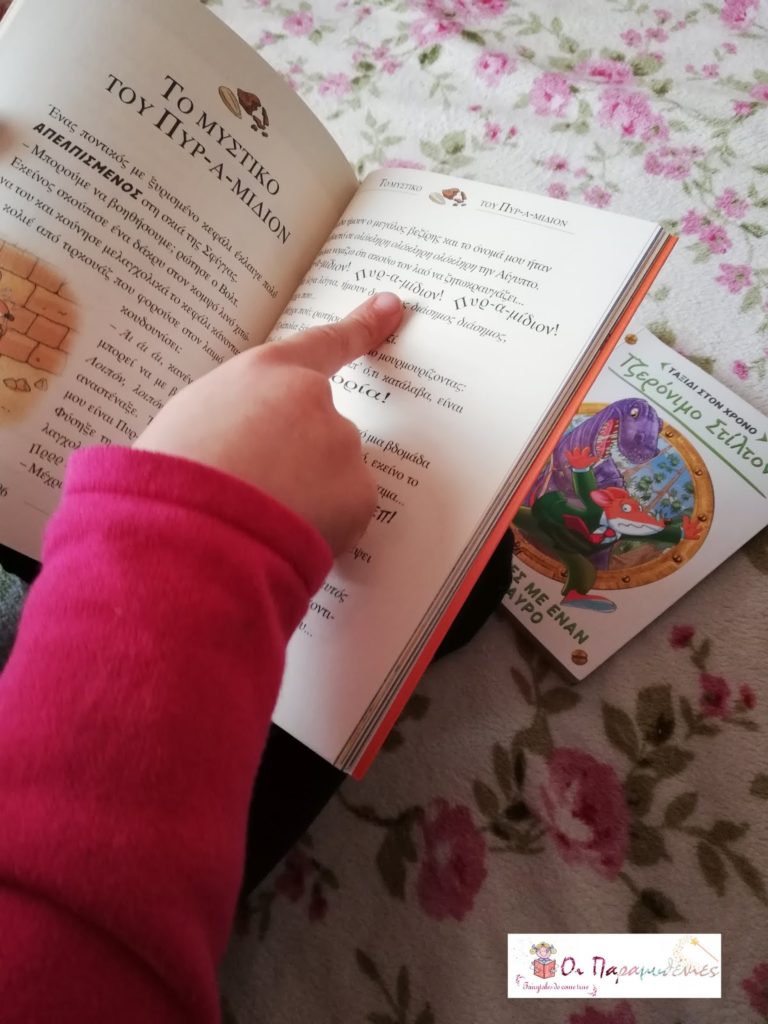 Εμείς διαβάσαμε (μέχρι στιγμής) απο τη σειρά Ταξίδι στο χρόνο, το Στενές επαφές με έναν Τυραννόσαυρο και Τα μυστικά των πυραμίδων. Εκτός απο το ότι είναι ευανάγνωστο και ευχάριστο για παιδιά ηλικίας 7+, μας εντυπωσίασε πως ανάλογα με τα συναισθήματα και τα βιώματα του μικροσκοπικού ήρωα το χρώμα και το μέγεθος της γραμματοσειράς αλλάζει και το κείμενο αποκτά κίνηση.