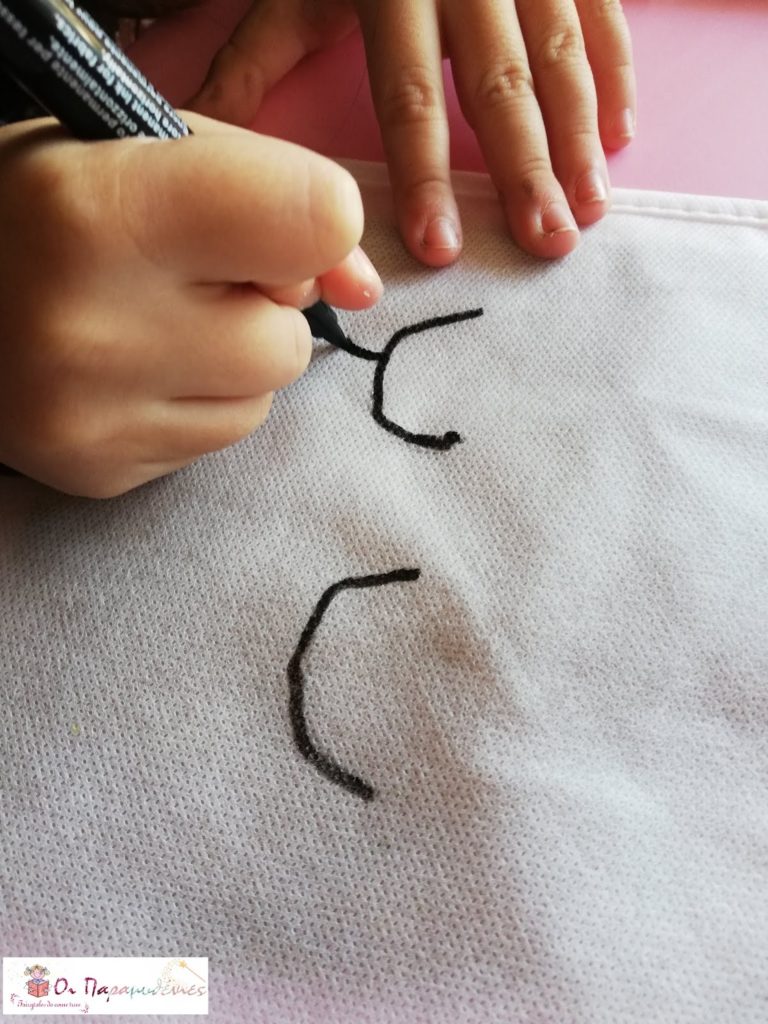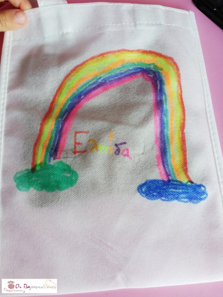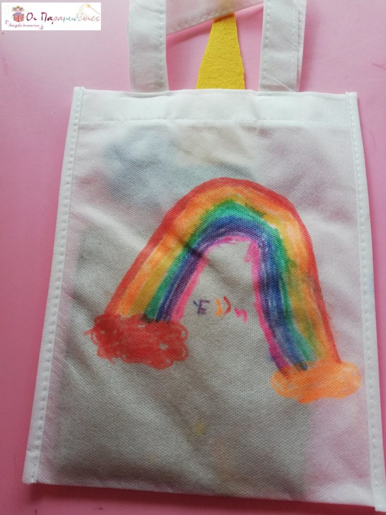 Ζωγραφίσαμε στη μια πλευρά της τσάντα μάτια και στη άλλη πλευρά ουράνιο τόξο.