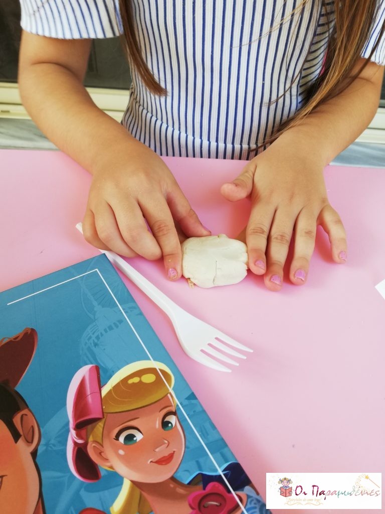 Βάλαμε πλαστελίνη για να κρατήσουμε ενωμένα τα πόδια και να στερεώσουμε το πιρούνι.
