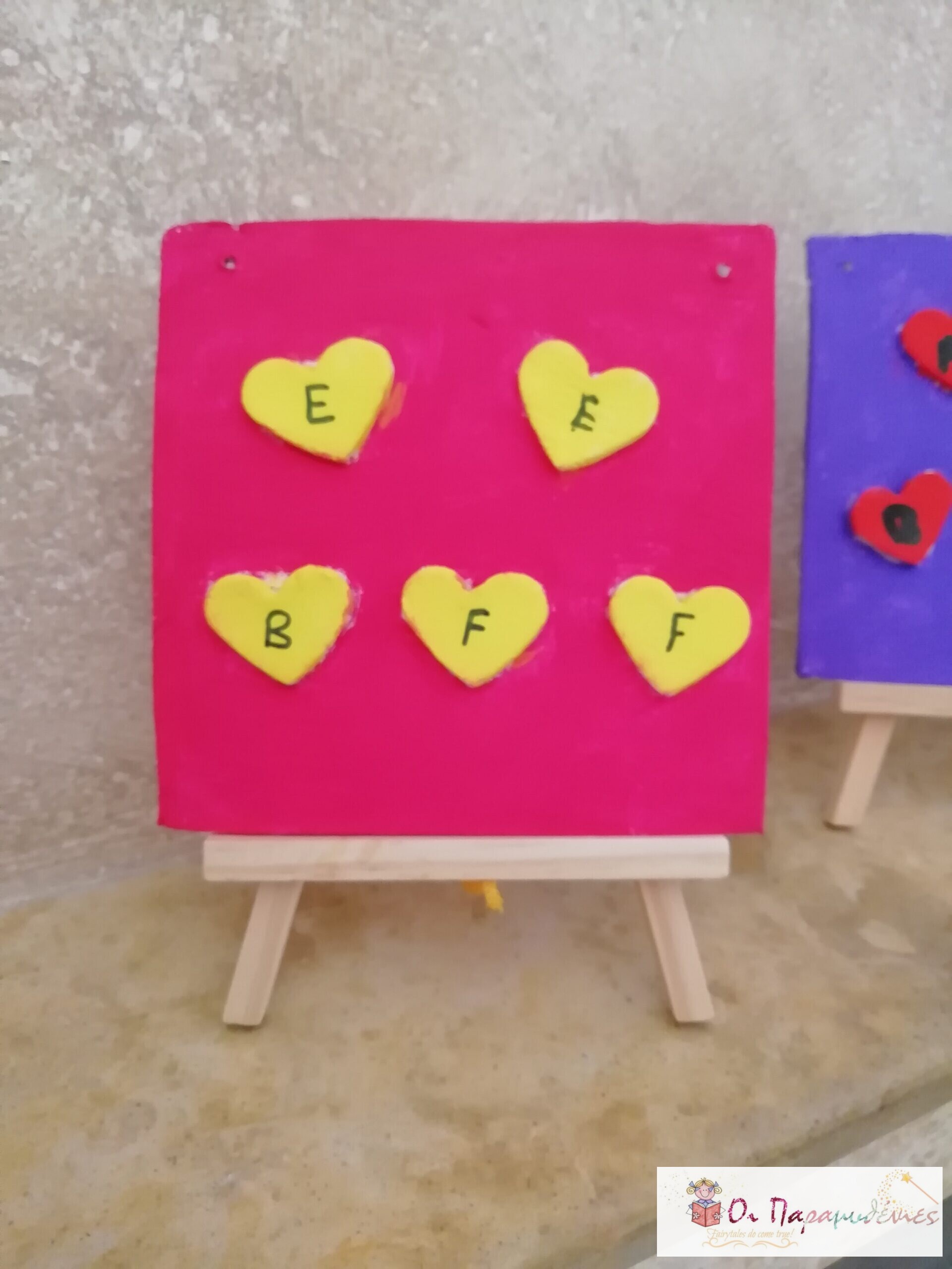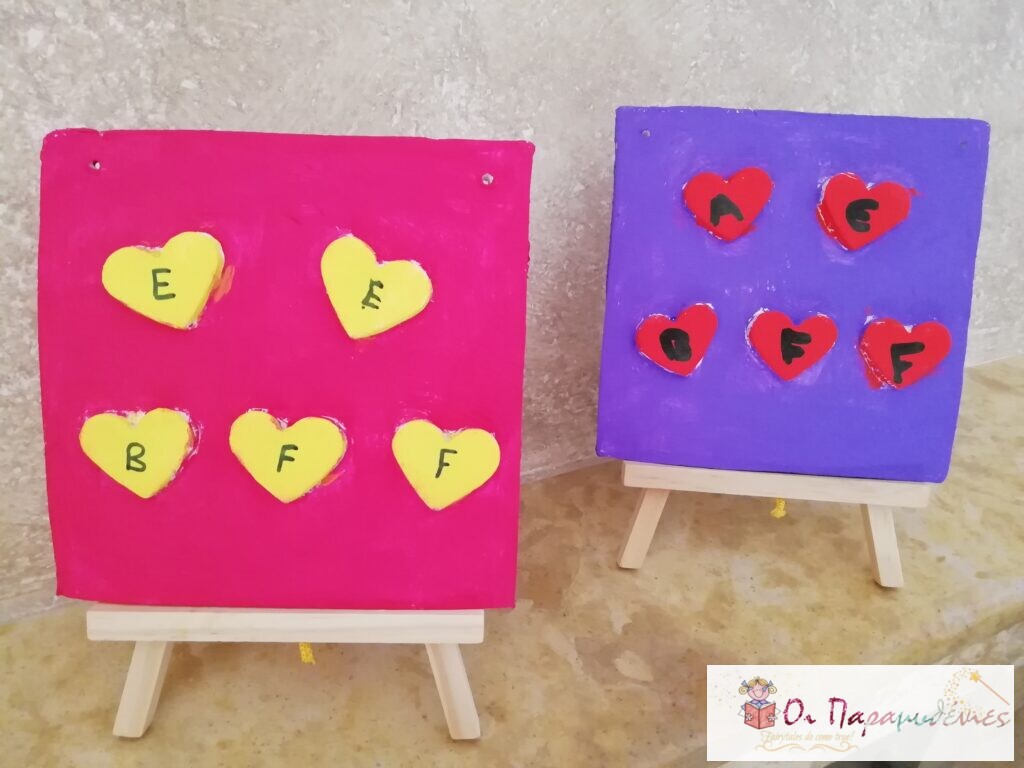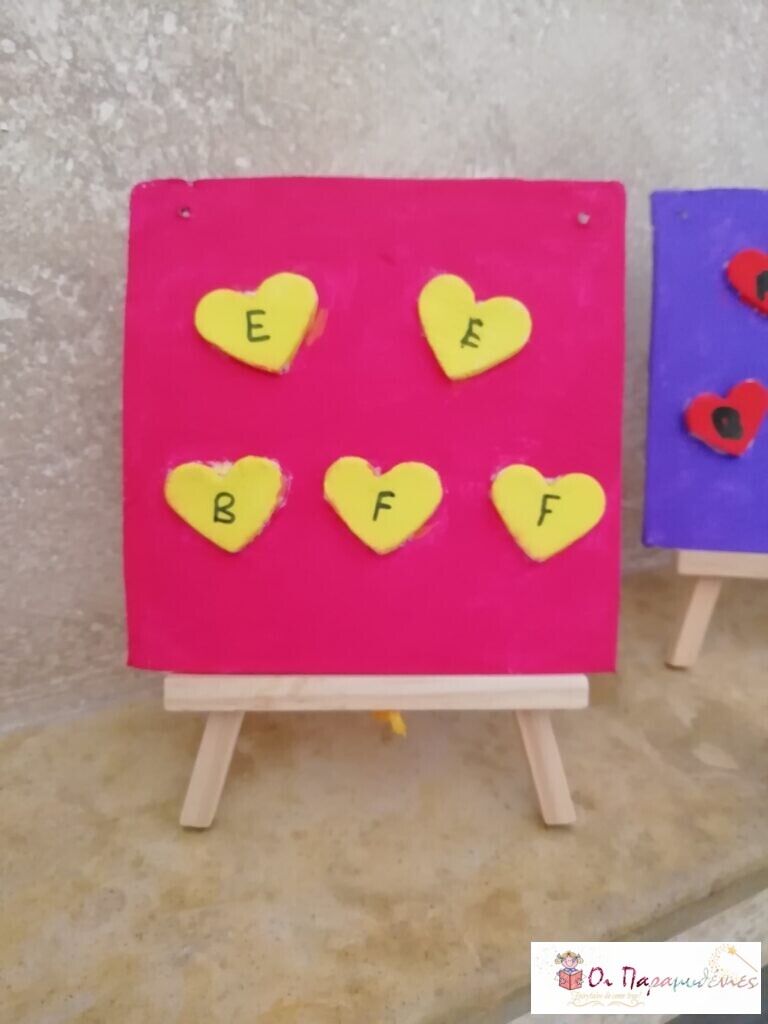 Εκτέλεση: Φτιάξαμε στο μέγεθος που επιθυμούσαμε καδράκια απο πηλό. Κόψαμε με κουπάτ πήλινες καρδούλες και πριν στεγνώσει ο πηλός περάσαμε λίγο νεράκι τη μια μεριά τις καρδούλες και τις κολλήσαμε στα καδράκια. Αφήσαμε μια ημέρα να στεγνώσουν καλά. Μετά τα βάψαμε στα αγαπημένα χρώματα των φίλων τους. Περιμέναμε να στεγνώσουν καλά τα χρώματα. Με μαρκαδόρο πάνω στις καρδούλες έγραψαν B.F.F.