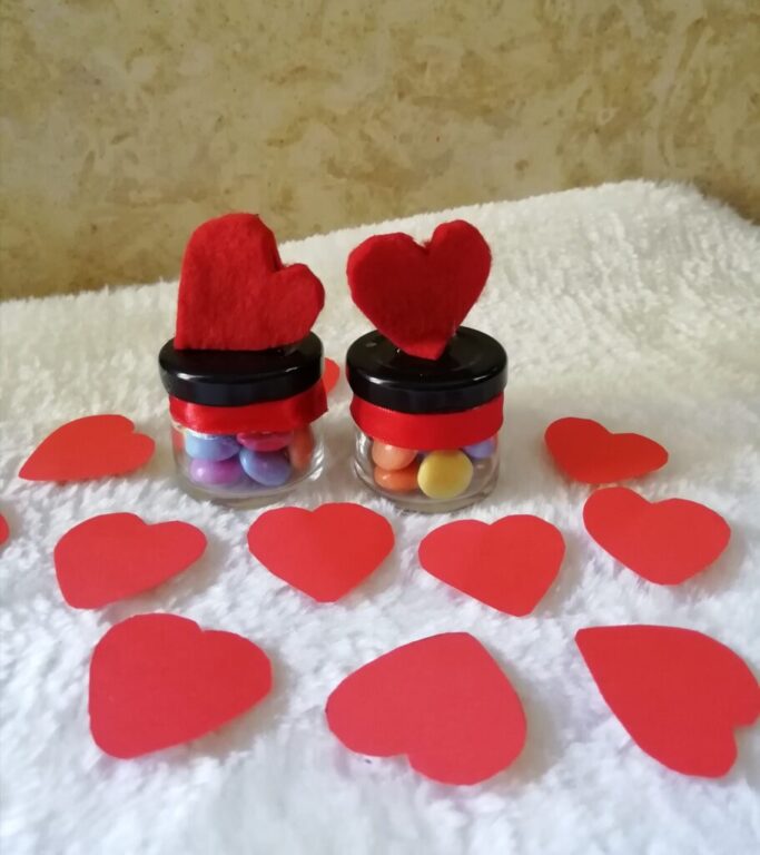 Εκτέλεση: Κόβουμε κόκκινη τσόχα σε σχήμα καρδιάς. Προσοχή να είναι σε μέγεθος ανάλογη με το καπάκι. Κόβουμε κορδέλα που κολλάμε πάνω στο βαζάκι. Κολλάμε τη τσόχινη καρδιά πάνω στο καπάκι. Εμείς σας δείχνουμε τους δύο τρόπους που την κολλήσαμε. Γεμίζουμε το βαζάκι με ζαχαρωτά της αρεσκείας μας.