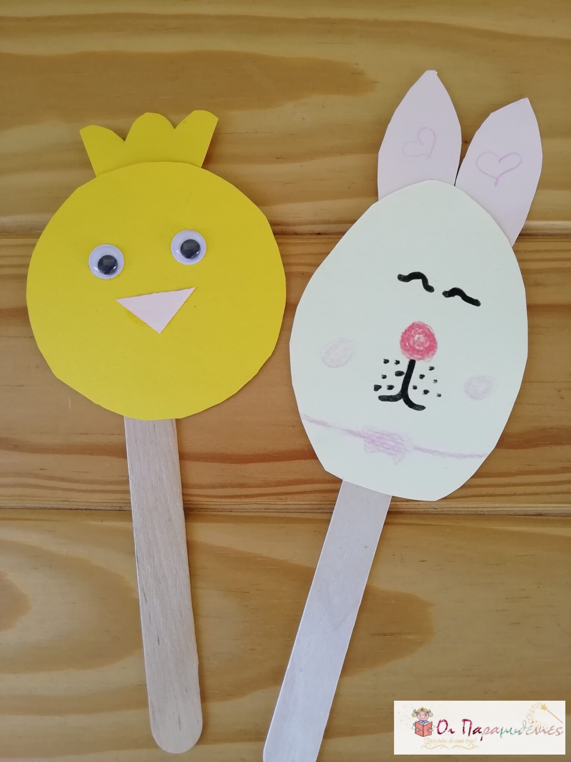 Εκτέλεση: Κόβουμε χαρτόνι σε σχήμα αυγό. Κάθε αυγό το κάνουμε φατσούλα που να θυμίζει κοτούλα, λαγό, παπάκι κ.α. Κάθε φατσούλα τη κολλάμε σε γλωσσοπίεστρο.