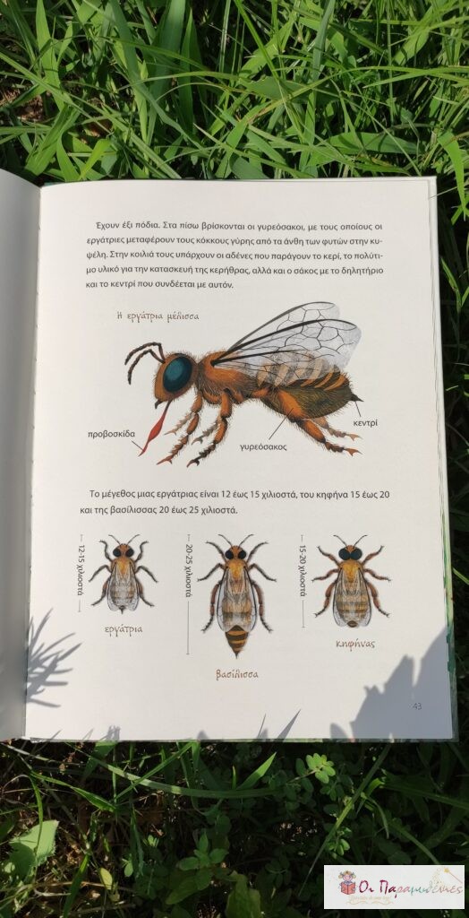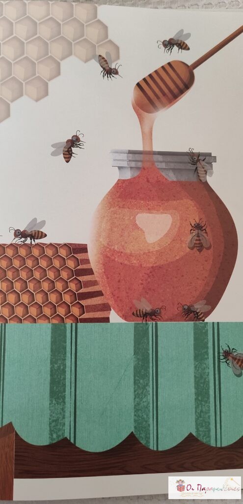 Στο παράρτημα του βιβλίου υπάρχουν αναλυτικές πληροφορίες για τις μέλισσες και το μέλι. Και ομολογώ πως πρώτη φορά διαβάσαμε με τα κορίτσια μου τόσες πολλές πληροφορίες με εικόνες για τις μέλισσες, τη ζωή στη κυψέλη, την επικονίαση ή τη μεταφορά της γύρης, το μέλι, τη σμηνουργία κ.α.