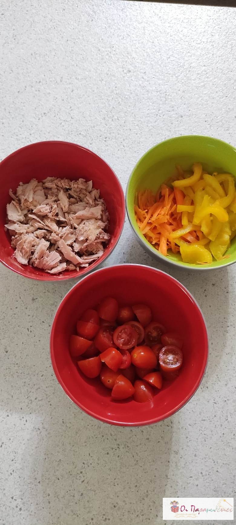 Εκτέλεση: Σε μια κατσαρόλα βράζετε τα ζυμαρικά και τα κρατάτε στην άκρη. Σε ένα βαθύ τηγάνι ή μια κατσαρόλα τσιγαρίζετε το κρεμμυδάκι και το σκόρδο. Προσθέτετε τα κομμένα ντοματίνια και το χυμό ντομάτας. Ρίχνετε τα κομμένα σε λεπτές λωρίδες καρότο και πιπεριά. Βάζετε ελάχιστο αλάτι και πιπέρι. Προσθέτετε τις ροδέλες ελιάς και τη κάππαρη. Και τέλος το τόνο που έχετε πρώτα θρυμματίσει. Αφήνετε να βράσει η σάλτσα και σβήνετε με λίγο λευκό κρασί. Όταν η σάλτσα σας είναι έτοιμη προσθέτετε τα βρασμένα ζυμαρικά και ανακατεύετε. Σερβίρετε και προσθέστε τυρί τριμμένο.
