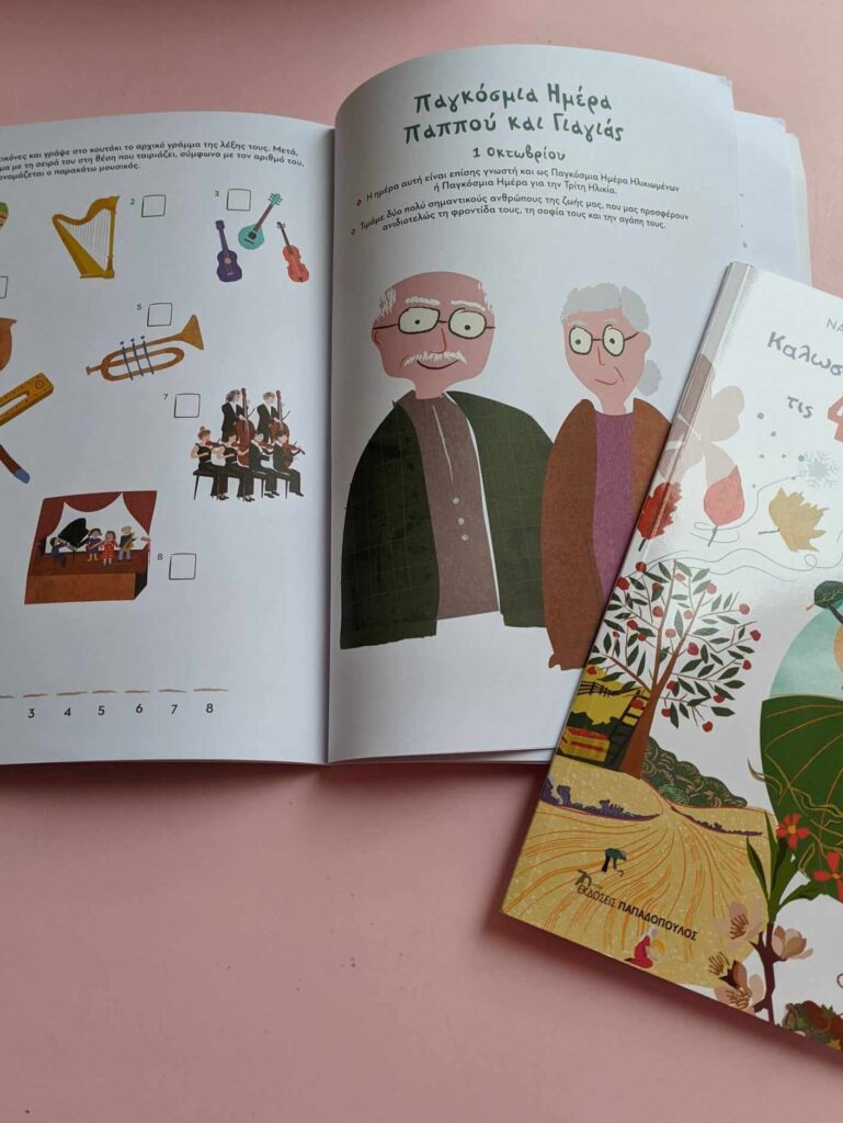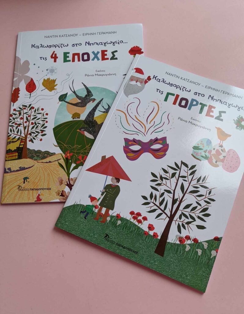 Καλωσορίζω στο νηπιαγωγείο….. τις γιορτές. Τα παιδιά μαθαίνουν για τις γιορτές τόσο της ελληνικής παράδοσης όσο και του υπόλοιπου κόσμου με κρυμμένες δραστηριότητες μέσα στο βιβλίο. Οι συγγραφείς των δύο αυτών βιβλίων είναι Ε. Γεραμάνη και Ν. Κατσανού.